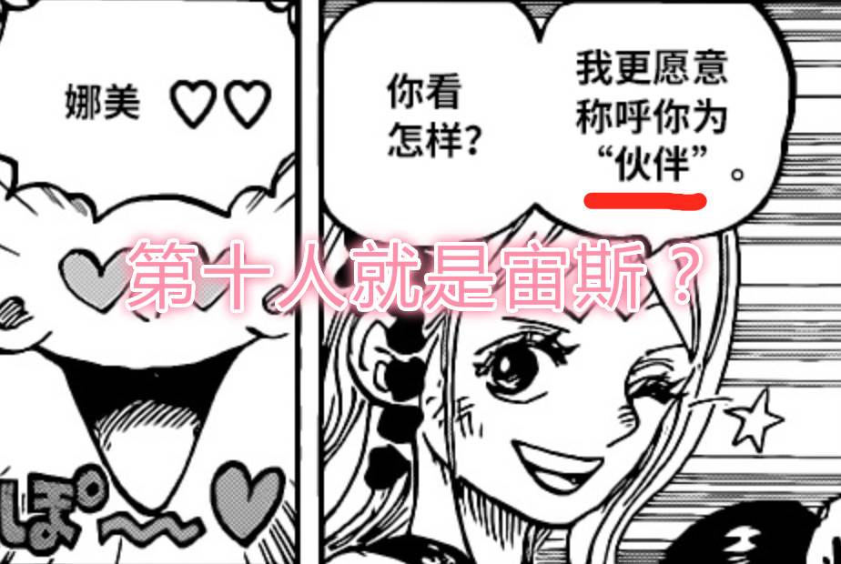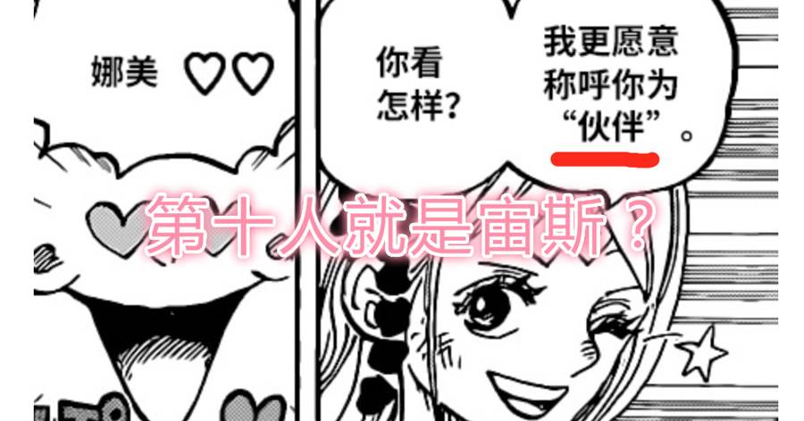 在娜美的內心裡,宙斯一直都是自己的夥伴呀!娜美這句話感動了宙斯,也讓我們看到了宙斯難道就是傳說中的【第十人】?搞了半天,第十人就是一朵雲嗎?哈哈!尾田:它不算人!